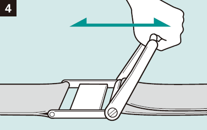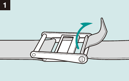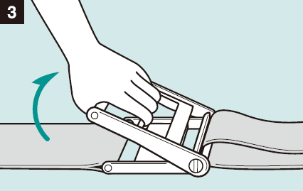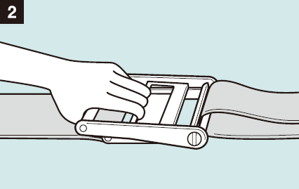 両端のフックを掛けます。両側のベルトに弛みが無くなるまで巻取り側ベルトを引っ張ります。